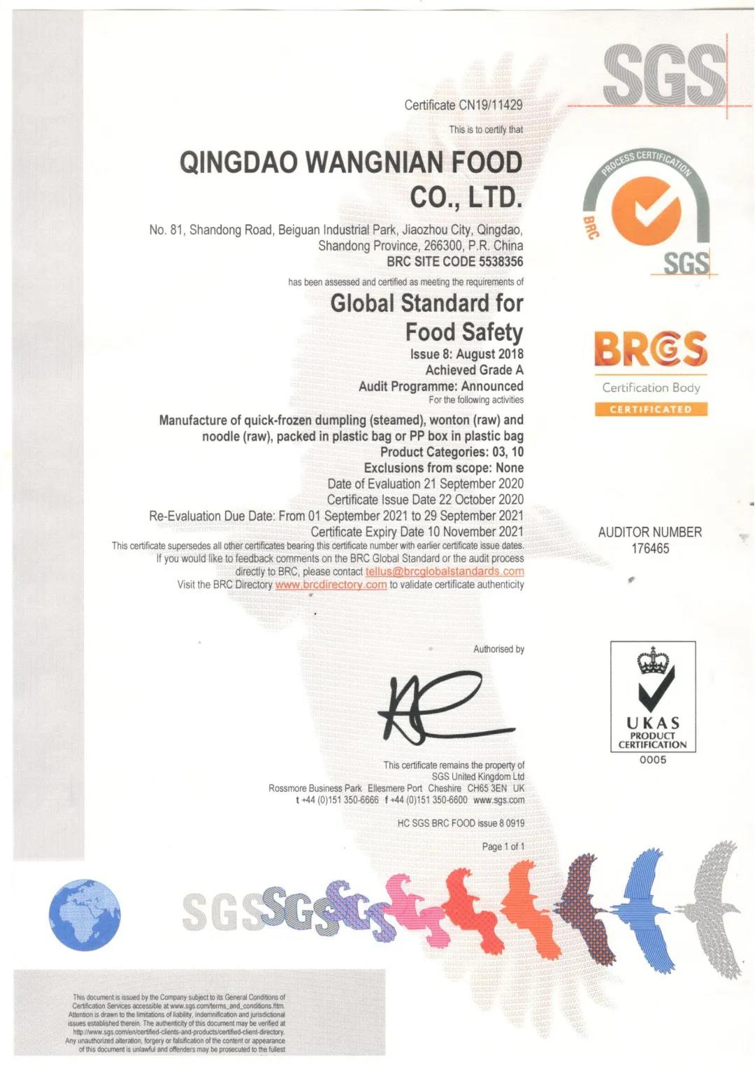 青島旺年食品有限公司榮獲BRC食品安全全球標(biāo)準(zhǔn)A級認(rèn)證